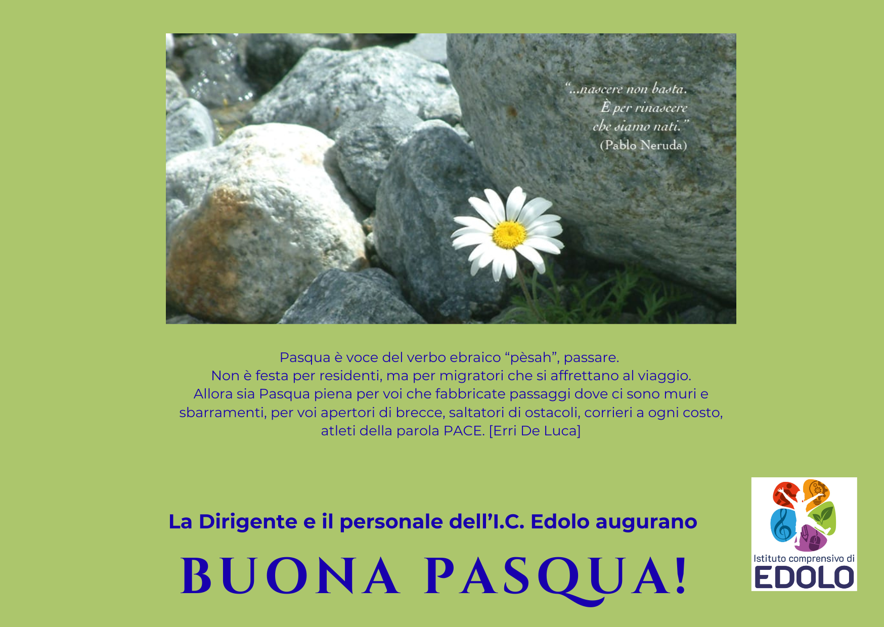 Pasqua è voce del verbo ebraico “pèsah”, passare. Non è festa per residenti, ma per migratori che si affrettano al viaggio. Allora sia Pasqua piena per voi che fabbricate passaggi dove ci sono mur (2)